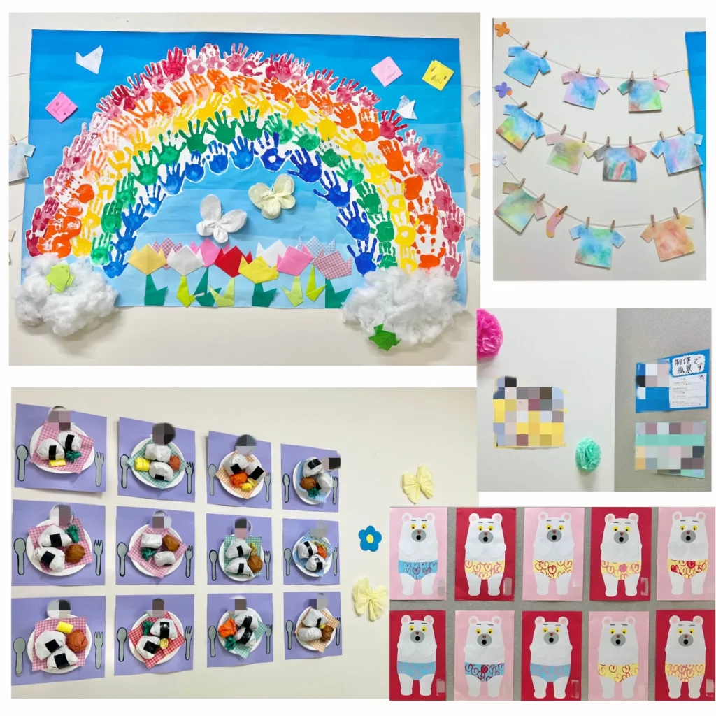 トイレットペーパーの芯を♡型にしてスタンプしたしろくまのパンツ🩲、子どもたちの手形で描いた虹🌈、削ったチョークを指でくるくるして描いたTシャツ👕、コーヒーフィルターに新聞紙を詰めて作ったおにぎり、折り紙の卵焼きや唐揚げをお皿に並べたおにぎりプレート🍙など…個性豊かな作品がそろいました✨️