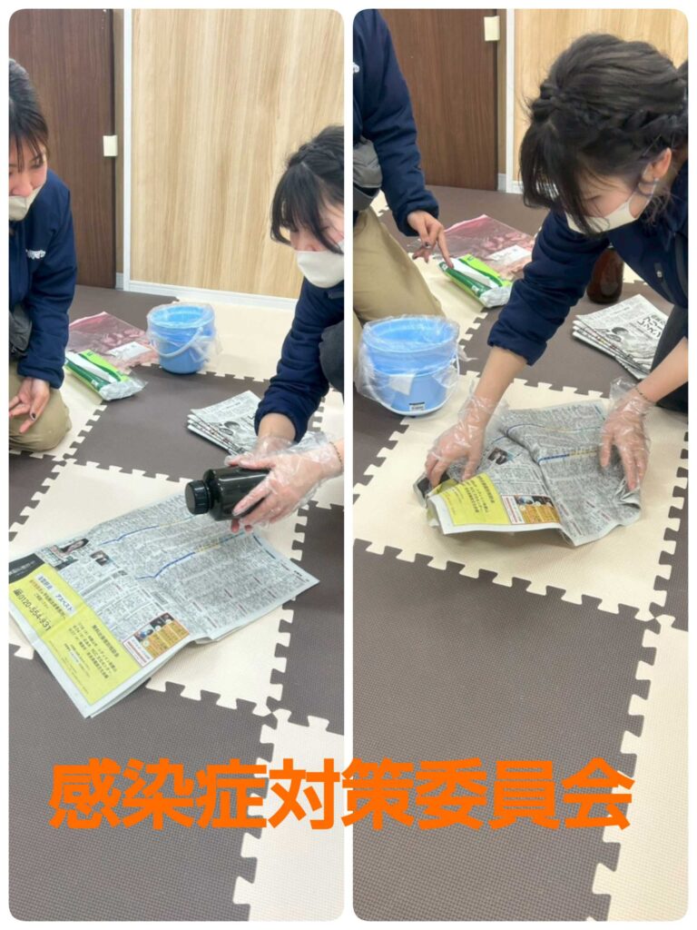今回職員と「嘔吐物の処理方法」を手順を確認しながら取り組みました。